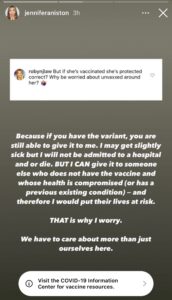 In her post, Aniston responded to a fan who had asked, “But if [Jennifer’s] vaccinated she’s protected correct? Why be worried about [having unvaxxed people] around her?”